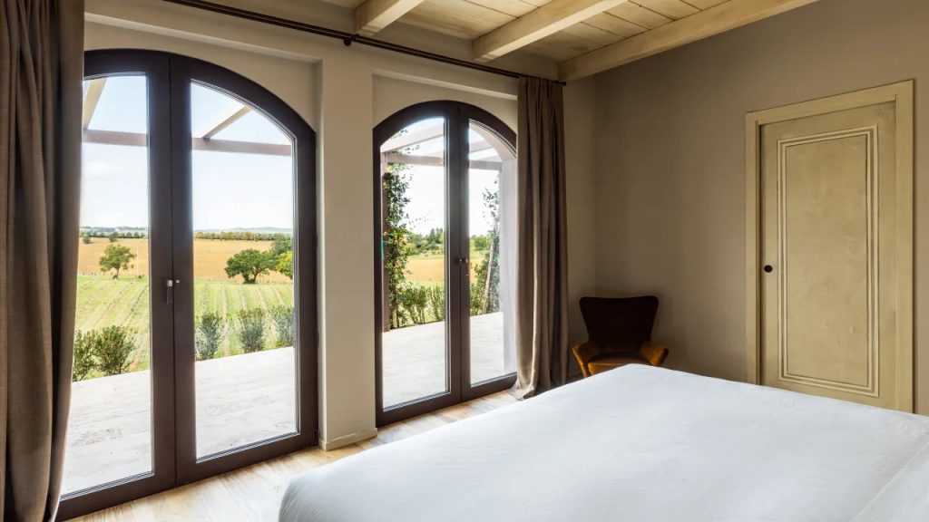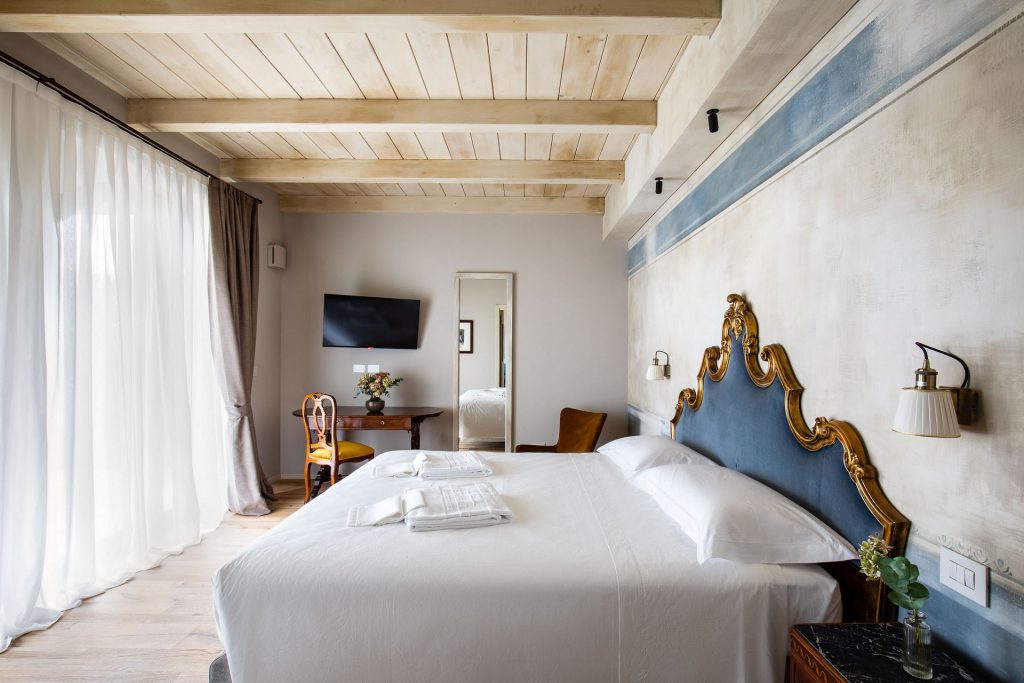 This double room with olive grove view has some special touches, with large spaces inside and out. It welcomes in natural light from the windows overlooking the surrounding olive grove. Amenities: 40” HD LED TV with digital terrestrial TV, minibar, air conditioning, Wi-Fi, safe, and private parking. 21 m2